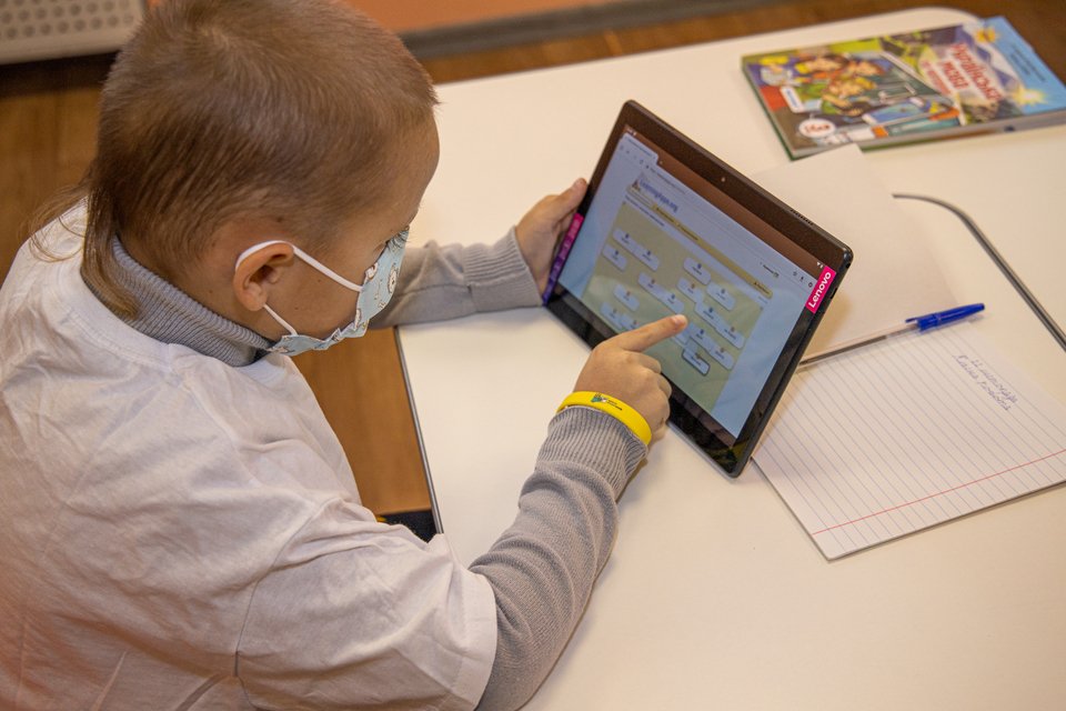 على حساب الأوبلاست تم ترميم غرفة الدراسة وتجهيزها بكل ما يلزم، وتم تركيب مكتبين فرديين وجدار علامة مغناطيسية ولوحة وسائط متعددة وأجهزة لوحية للطلاب في الفصل المشرق والمريح.