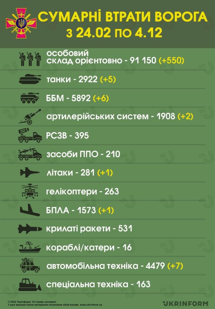 بوابة اوكرانيا – كييف – 4 كانون الأول 2022 -في تقرير لهيئة الأركان العامة للقوات المسلحة الأوكرانية نشر على فيسبوك كتبت فيه أنه في الفترة من 24 فبراير إلى 4 ديسمبر، قضت القوات المسلحة الأوكرانية على حوالي 91150 من الغزاة الروس، بما في ذلك 550 جنديًا.