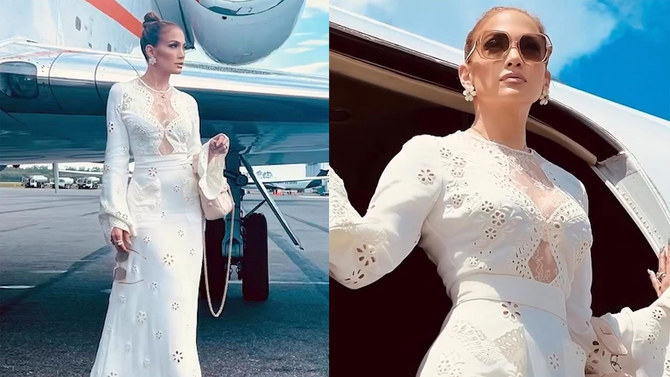 وكتبت المصممة على Instagram، وهي تشارك صور النجمة: “تنهي Jlo الأسبوع بأناقة أثناء رحلتهاdelola مرتدية إطلالة ELIE SAAB لربيع وصيف 2023 مكمّلة بنظارات ELIE SAAB”.